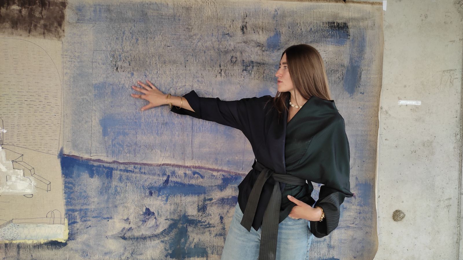 – Kad krećem u proces slikanja, to je više instiktivno slikarstvo. Ne razmišljam previše o motivima. I ova slika sama se nekako razvijala, slojeve se slagali. Ispod ove slike se nalazi totalno druga kompozicija, totalni konstruktivizam i onda je došlo do slaganja ovih slojeva. Na kraju sam dobila ovaj efekat tornja. Jednostvano ovi pikturalni elementi koji se dešavaju u lijevoj gornjoj polovini su me naveli na planinu Konjuh na kojoj sam inače bila. Iz nekog razloga su me podsjetili na borovnice (inače planina Konjuh je puna borovnica) i onda me podsjetilo na to rodno mjesto moje nane i zamislila sam baš taj momenat pred svitanje, sabah. Moja nana odlazi na sabah namaz, ezan je doziva. Ima jedan interesantan detalj. Zapravo, ona je bila u feridži. Moja nana nije željela da skine feridžu iako u to vrijeme zakon je tražio da se skine što ona nije htjela. Čak je nekoliko noći provela u policijskoj stanici zbog toga. Zato sam napravila tu povezanost kroz liniju sa džamijom kroz njenu feridžu, pojasnila je Elmedina.