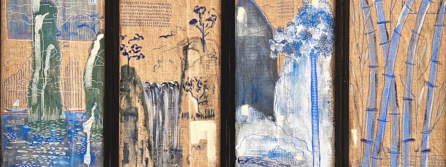 The front is divided into four linen-covered panels, each becoming a canvas. I painted directly on-site, without sketches, letting the composition flow naturally. Inspired by nature and the aesthetics of traditional Asian art, the piece reflects the calm, expansive feel of a Hokusai landscape.