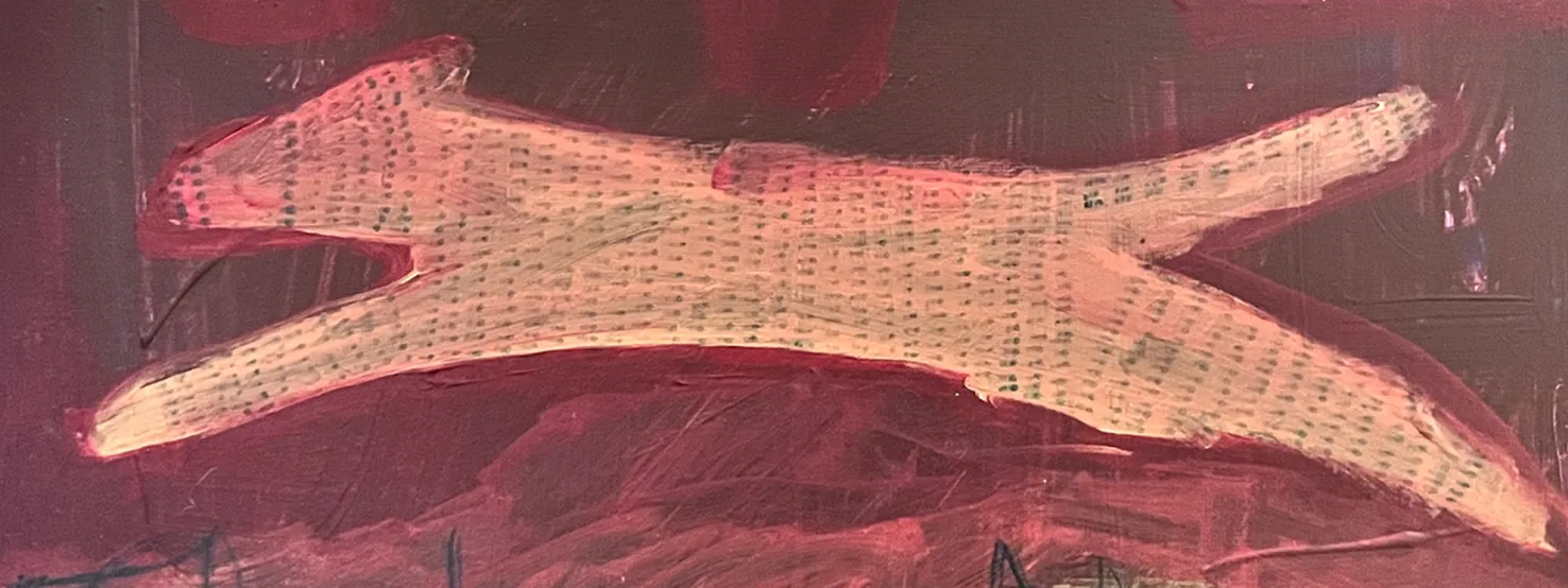 El Medina in Africa is an art piece that depicts a cheetah in full motion, captured mid-run and jump. The cheetah’s body is marked by an intriguing pattern, with multiplying dots that flow across its form, enhancing its dynamic movement. The intense brown and red background evokes the heat and energy of the African landscape, while a greenish layer at the bottom represents the earth and weeds, grounding the composition. An alphabet element embedded in the piece forms the title, adding a layer of symbolism. The artwork embraces an African totemic, simplified style, blending natural elements with the artist’s emotions and experiences in that moment.