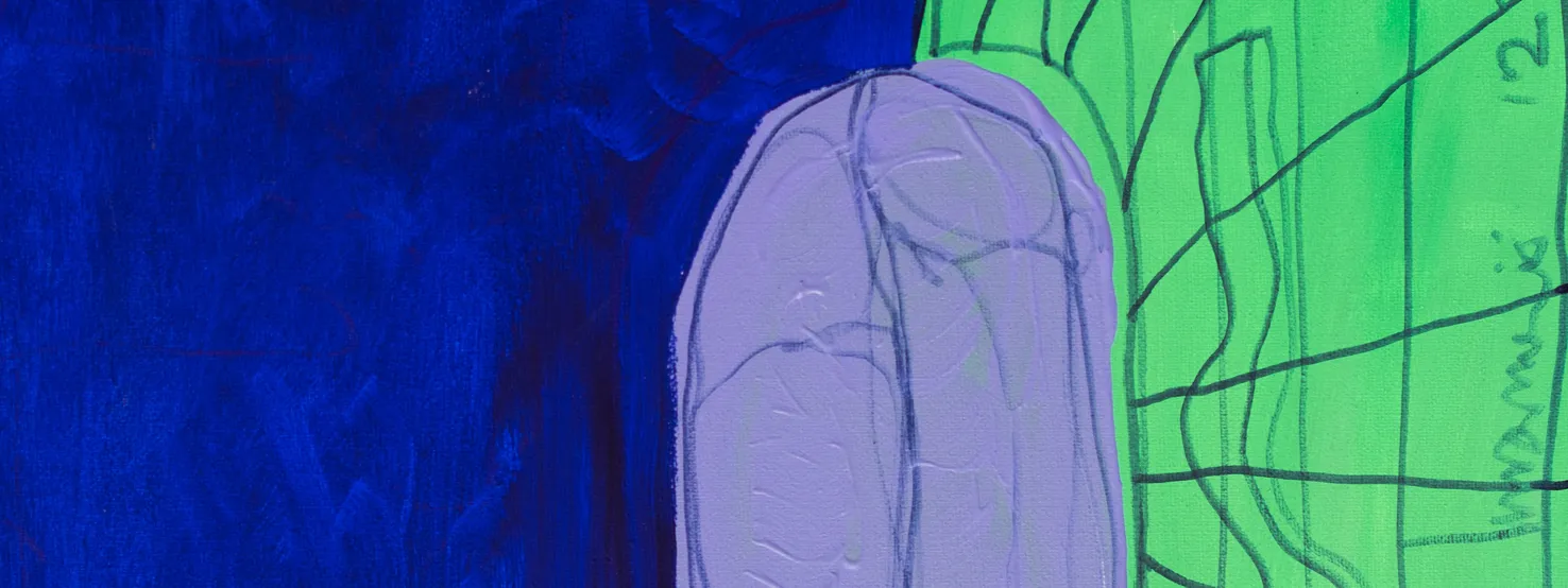 This artwork depicts a living room featuring a sofa and a plexiglass wavy table. The composition plays with the proportions between light green-neon and dark blue, creating a distinct contrast. The piece is deeply connected to my architectural background, drawing from my everyday work and knowledge in the field.