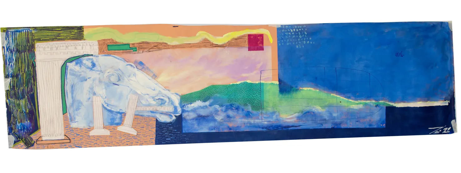 The artwork is presented on a long horizontal canvas, with a composition built through various layers and proportions. It incorporates acrylic paints alongside other media, such as markers and graphite or charcoal. The themes of the painting are primarily paysages, depicting islands, the sea, and the interplay between the near and distant sea, using different pictorial and pattern elements. The composition also includes the head of a horse alongside a demolished acropolis. The piece is an unconventional work, combining different areas, stories, and techniques to create a unique visua