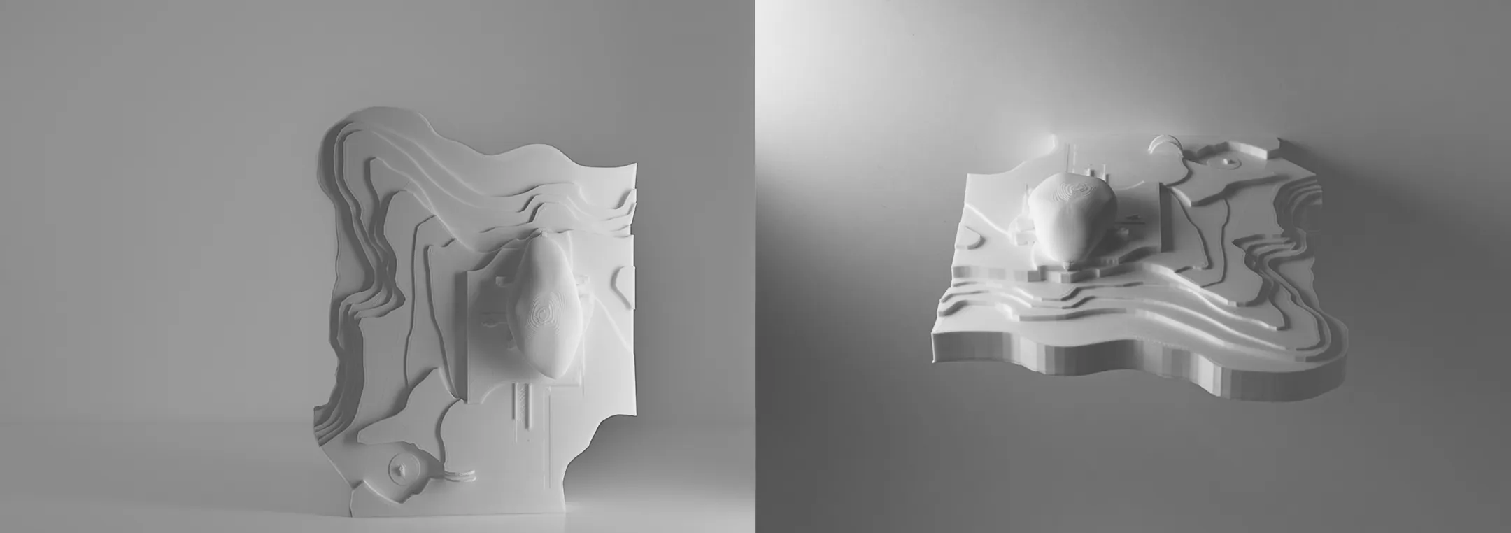 In terms of volume and architectural plasticity, the monastery’s design adopts a naturalistic, minimalistic style inspired by the stone found on-site. This stone, resembling an eggshell in volume, became the foundation for the form, with its shell-like structure influencing the building’s configuration and morphology. The design aims to create a topology deeply connected to the micro-location, respecting the relief and natural elements of the surrounding landscape. The plasticity of the structure replicates the stone’s characteristics, ensuring it harmonizes with the area, which is protected due to its architectural and historical significance. By integrating the architecture with the natural elements, the monastery honors and respects its environment, forging a profound connection with the landscape while maintaining sensitivity to its context.