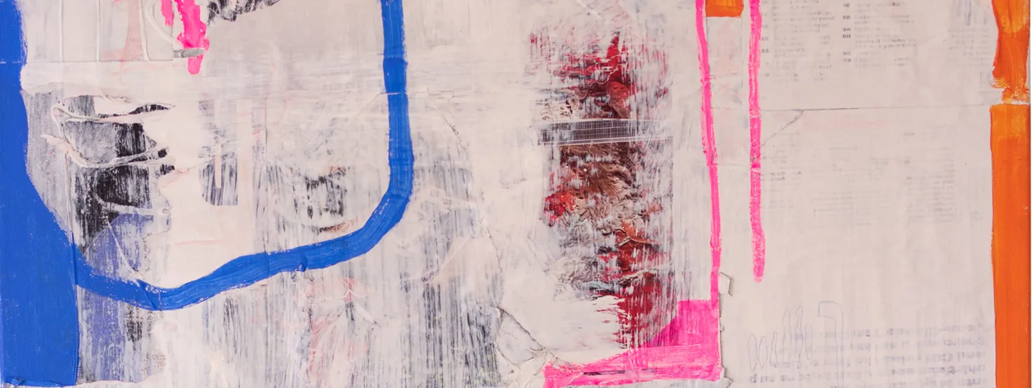 OJU, the final piece in the series, is the most simplified painting, focusing on dynamic, amorphous lines that flow across a white surface layered with texture. The texture is built up from magazine pages featuring subjects like motorcycles and mountain biking, adding depth and movement to the composition. Initially minimalistic in terms of color, the piece becomes dynamic through its layered texture. The lines subtly form the letters O, J, and U, which gives the painting its title. The pictorial color elements enhance the composition, making it visually engaging and full of energy.
