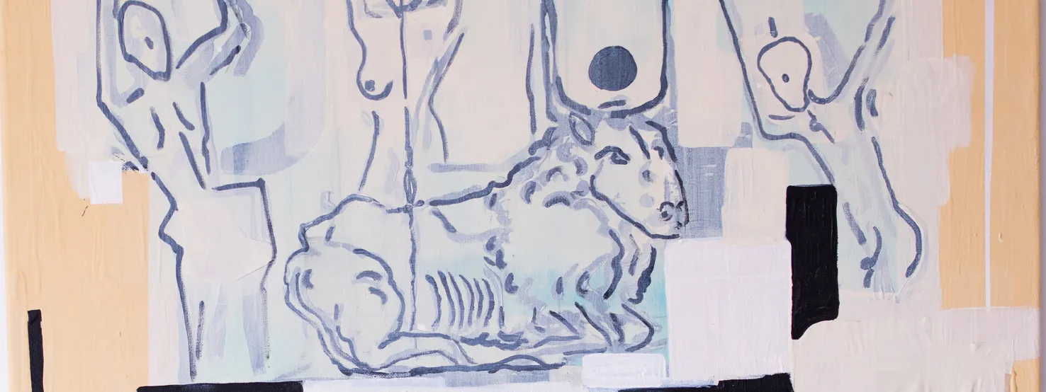 This painting is a reflection of my life experiences and the events that shaped me during the year it was created. With a readable composition, it features architectural details, animal totems, and symbolic elements. Made using a mix of oil paint for metal, collage, and various materials, the piece embodies a layered, textured expression of my journey.